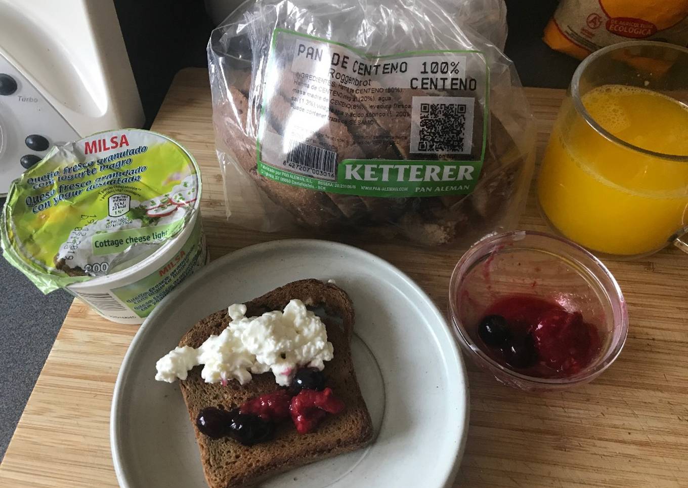 #weekendreto Desayunos. Sencilla tostada con algo saludable encima y color. Arándanos y Frambuesas sobre tosta de centeno y queso cottage 0%, similar al requesón