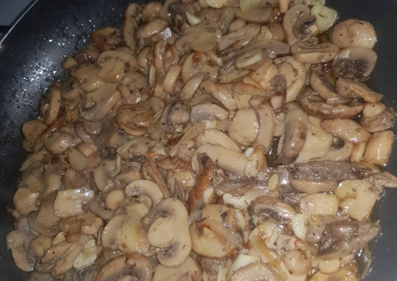 - Una vez hecho esto, se trocea la cebolla y el ajito.La cebolla se hace lentamente hasta pocharla y seguido se le echa el ajo para que todo se quede casi listo, ahí es cuando se echa los champiñones y todo se remueve junto, de esa forma el champiñón cogerá el gusto.Seguido se le echan los aliños y con fuego medio se va haciendo hasta dorarlos y listo para servir.