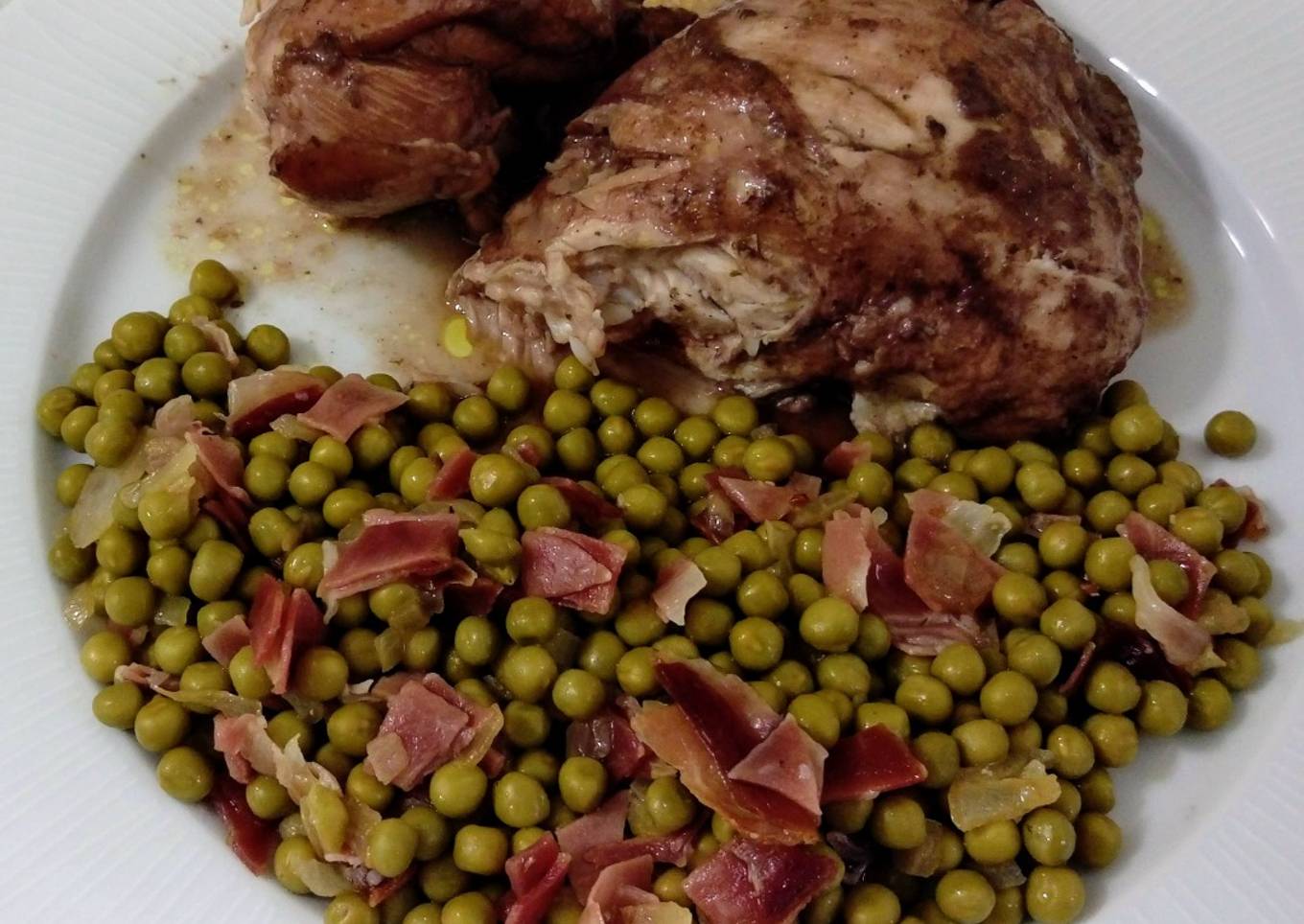 - En cada plato echamos un par de trozos de pollo y un poco de guisantes con jamón y a disfrutar comiendo.
