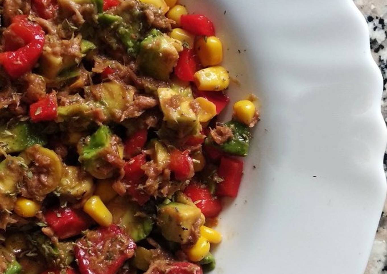 - Cortamos el tomate y el aguacate en cubos y le añadimos la lata de pimientos del piquillo escurrida y cortada en cuadritos, la lata de atún también escurrido, las olivas verdes, el maíz, un chorrito de aceite de oliva y otro de salsa de soja. Removemos bien y espolvoreamos con orégano.