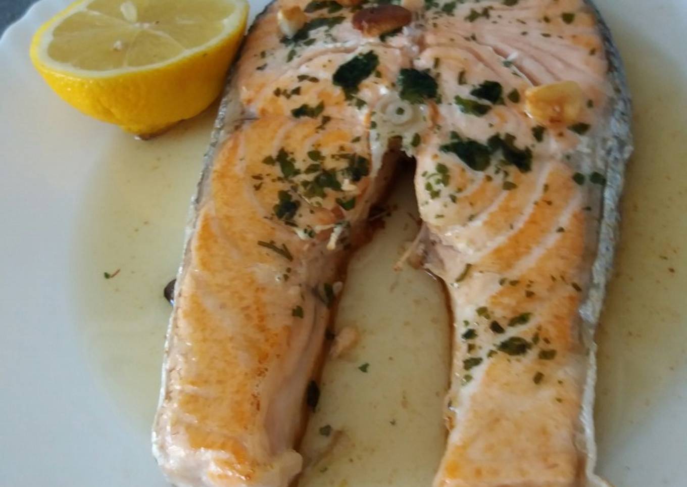 - Se pone el aceite en la sartén (muy poco). Cuando esta caliente se.pone la rodaja de salmón con un poco de sal. Se le añade el ajo picado teniendo cuidado de que no se queme. Se dora por los dos lados. Se espolvorea con el perejil picado