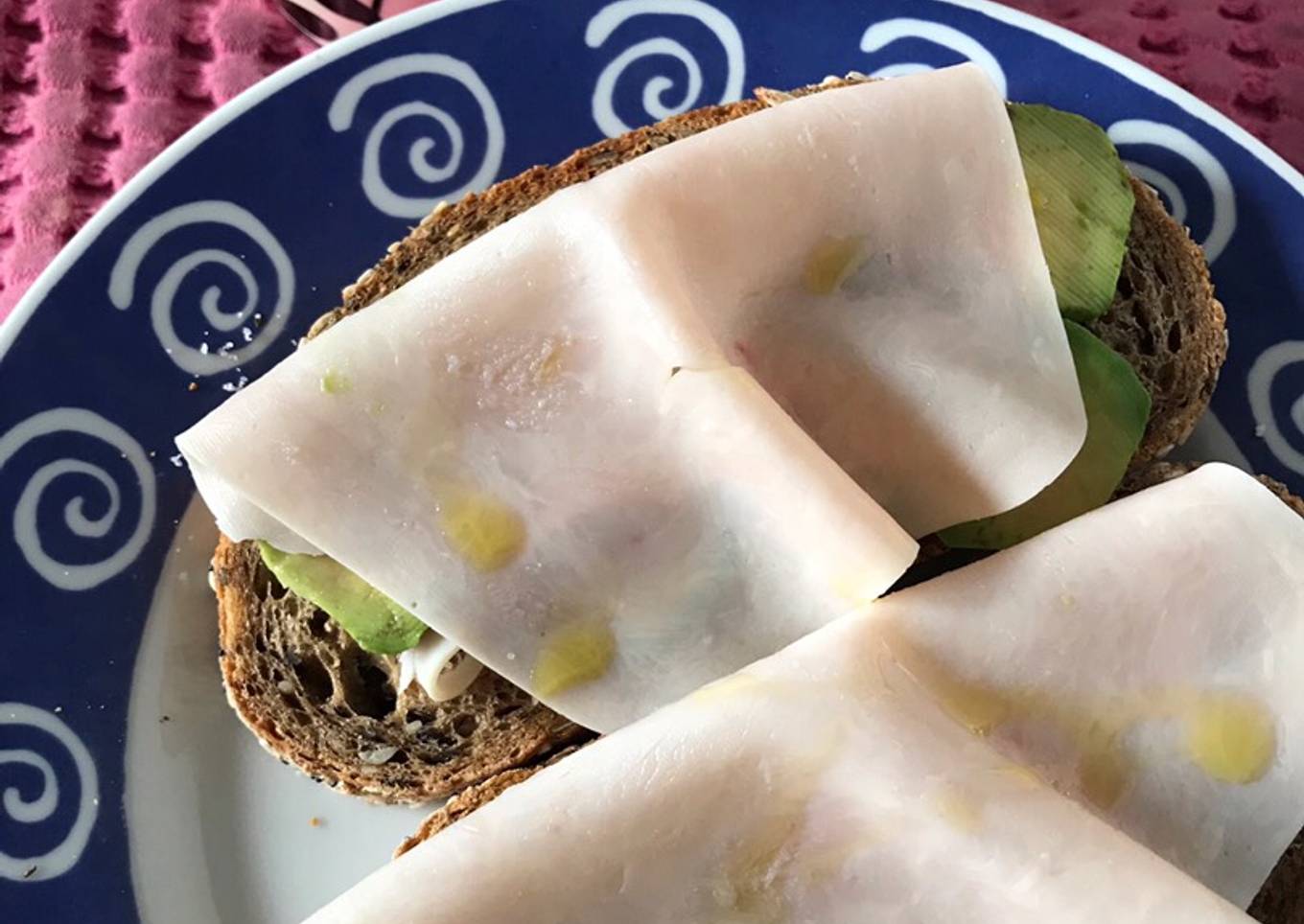 - Tostar el pan. Poner un poco de aceite y colocar encima rodajas de aguacate. Poner un poco de aceite y sal. Por último, las lonchas de pavo. Unas gotitas de aceite y a desayunar con un café descafeinado con leche de avena. BON PROFIT!!!