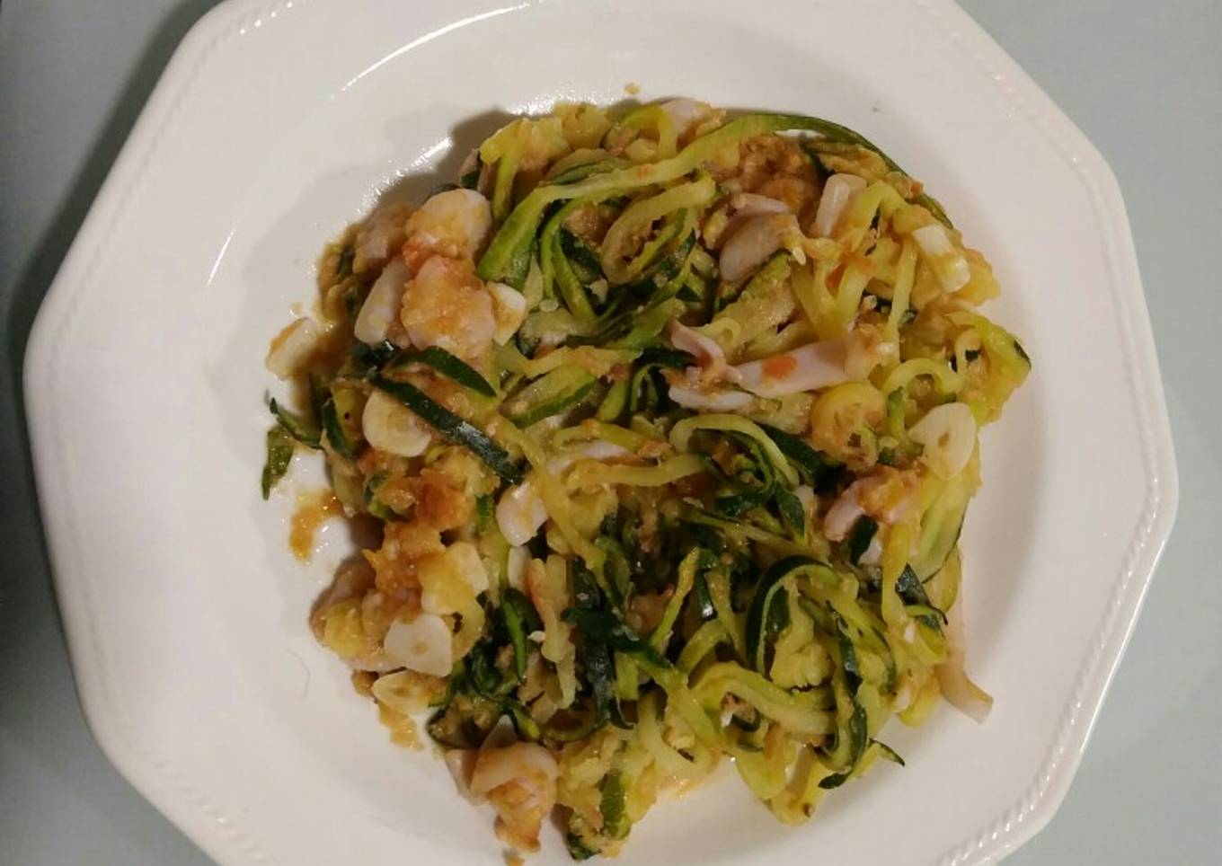 - Lavar y secar el calabacín. Cortar el calabacín con un espiralizador o con el cuchillo haciendo la forma de espaguetis. Hervir los espaguetis 5 minutos. Escurrirlos y reservar.