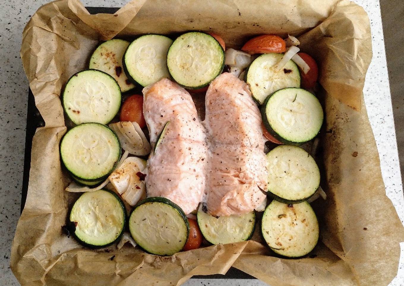 - Colocar el salmón encima de las verduras.
