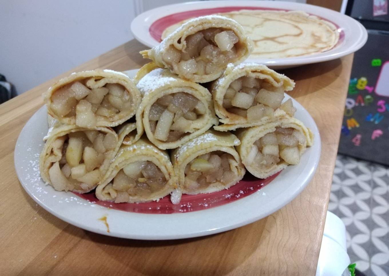 - Cocinar hasta dejar a tu gusto la manzana, yo la dejé intermedia, ni molida ni crujiente. Teniendo las manzanas listas y los panqueques, solo queda rellenar, enrollar, espolvorear con azúcar, servir tibios y a disfrutar!