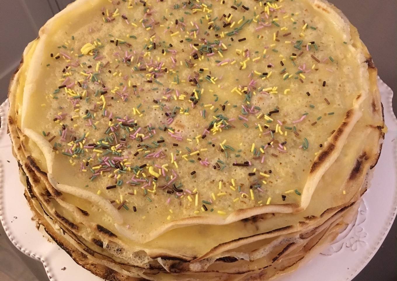 - Mezclar todos los ingredientes para hacer la masa. Cocer las crêpes. Poner una crêpe en un plato, untar de crema de limón, otra crêpe, untar de crema.... Hasta 15 a 18 crêpes.