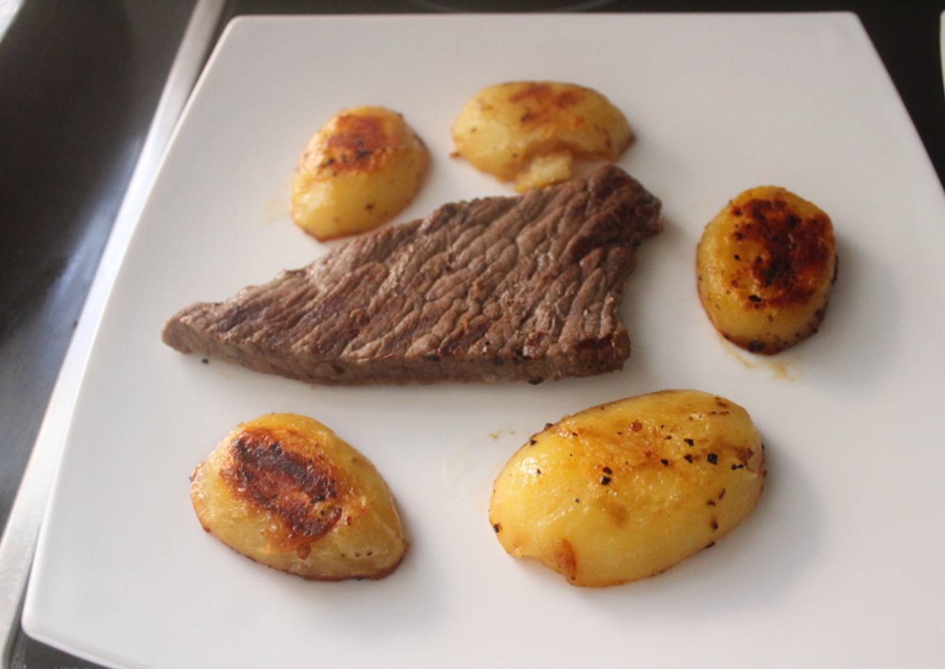 - Colocar un trozo de carne y cinco mitades de patatas en cada plato.